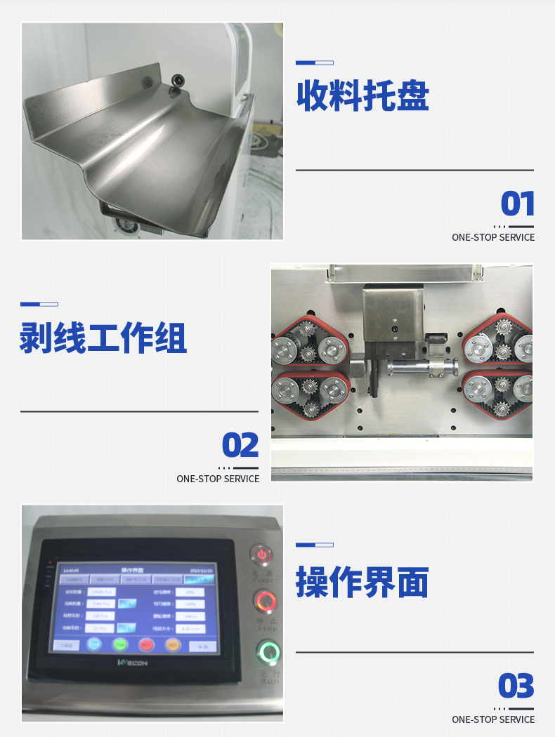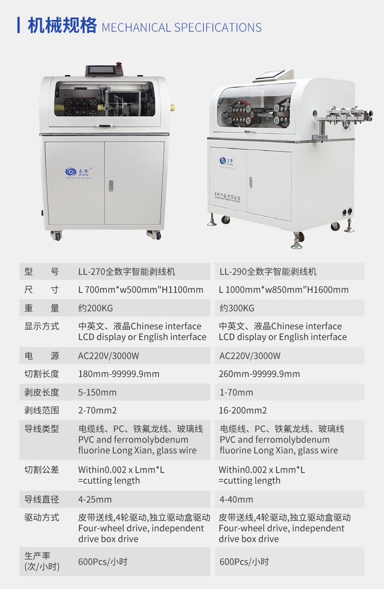 LL-270剝線機主要針對大平方電纜線切斷,剝皮難而開發,該機器采用皮帶伺服送線保證不傷線及確保線長得精準度;其中刀座還采用了蝸輪增壓式可輕松裁切橫截面達到70平方毫米和最大外徑25毫米的電纜線;另配套分離式放線架讓進料更穩定;中英文液晶顯示,全參數化操作系統、強大的數據庫保存功能;操作簡單、易懂。